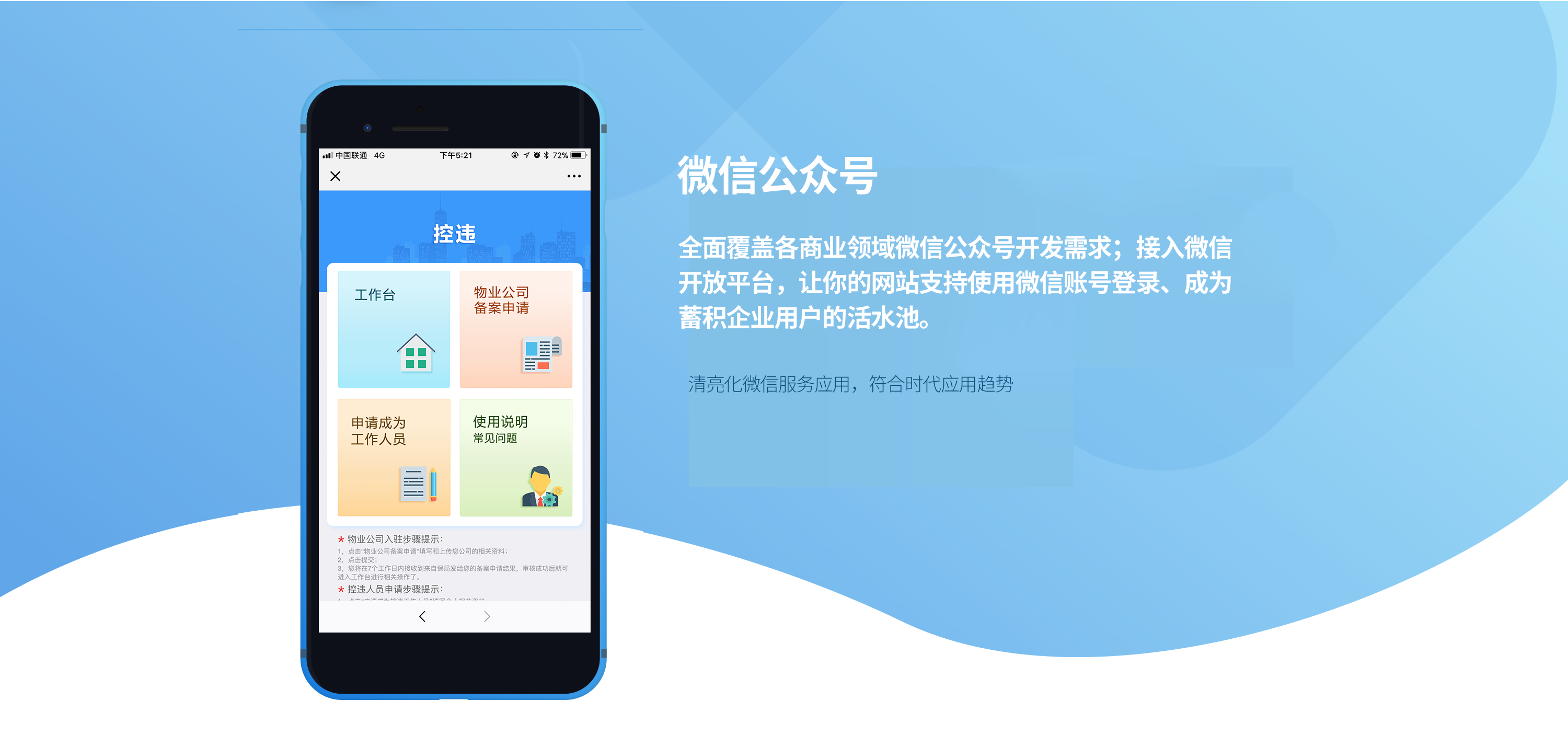 微信服务号开发,为企业、组织定制功能齐全的公众号服务平台,一次开发,提升企业和组织的业务能力和用户管理能力,同时让营销变得简单
